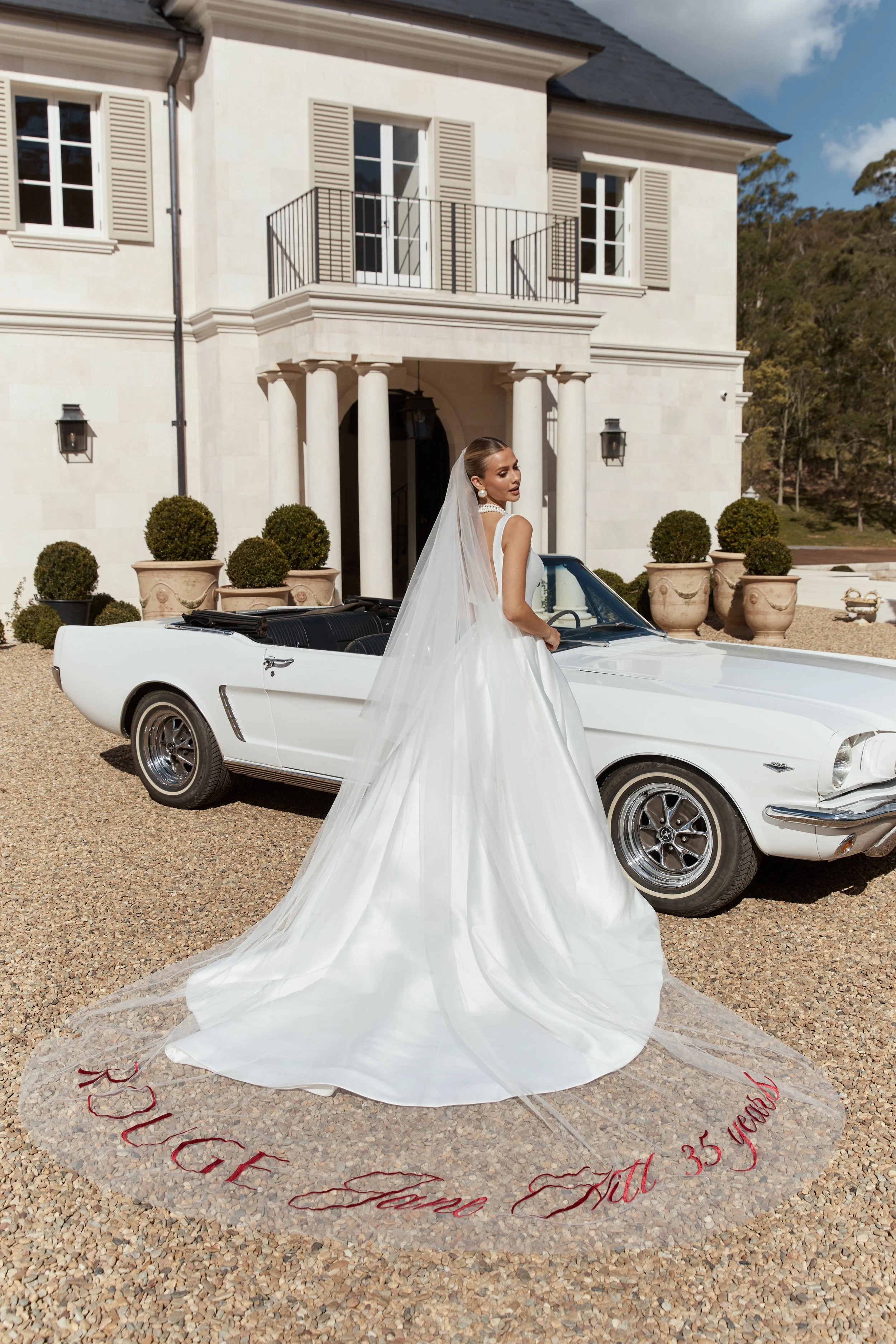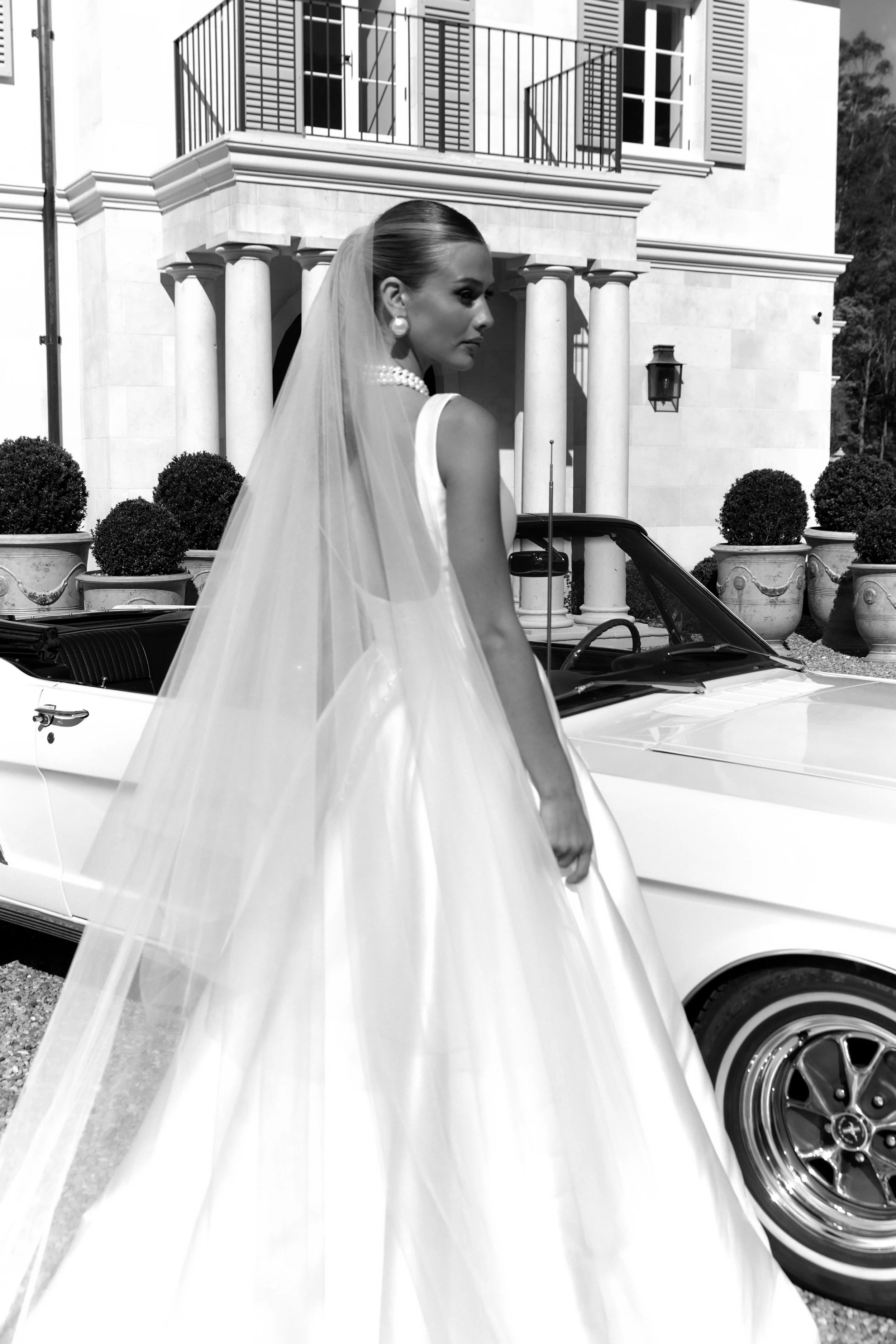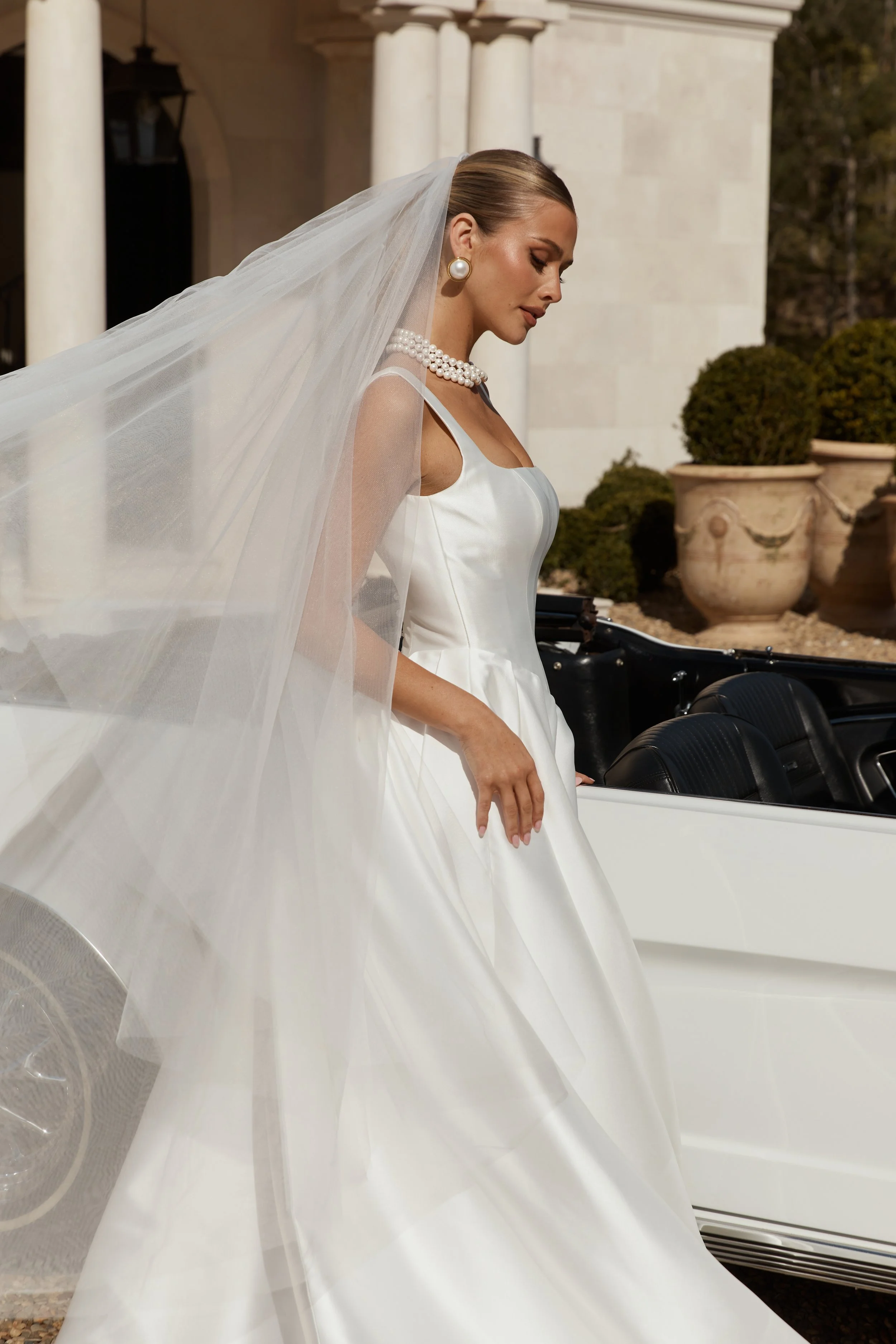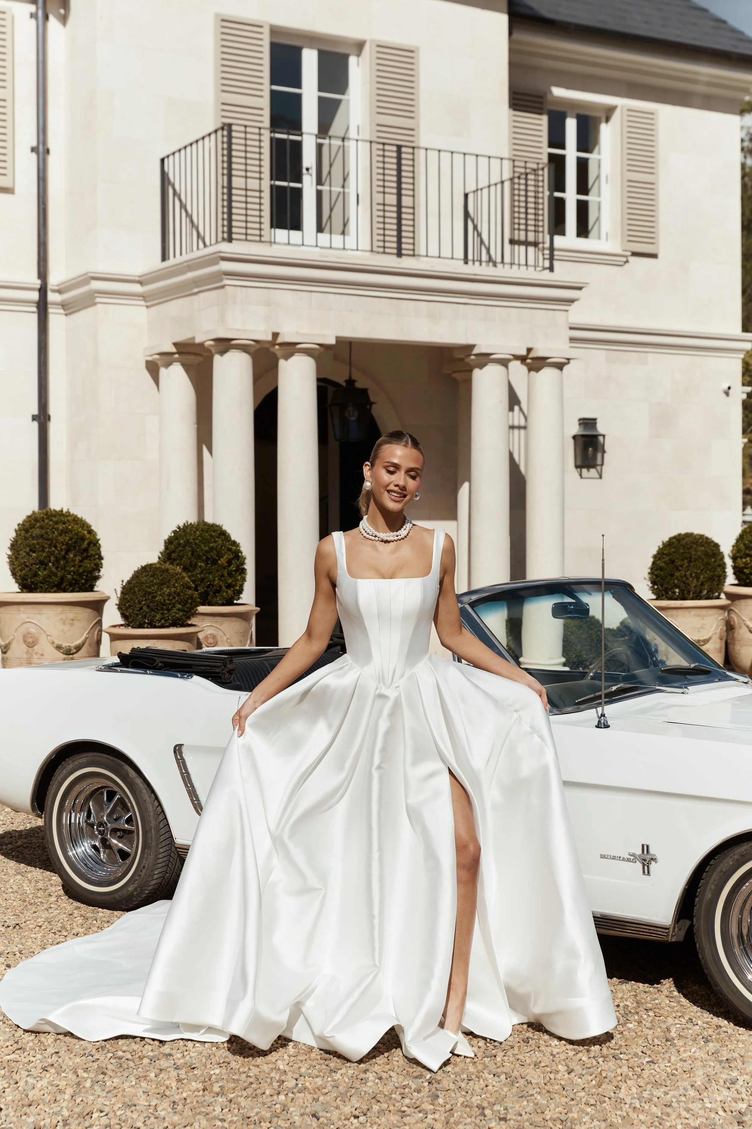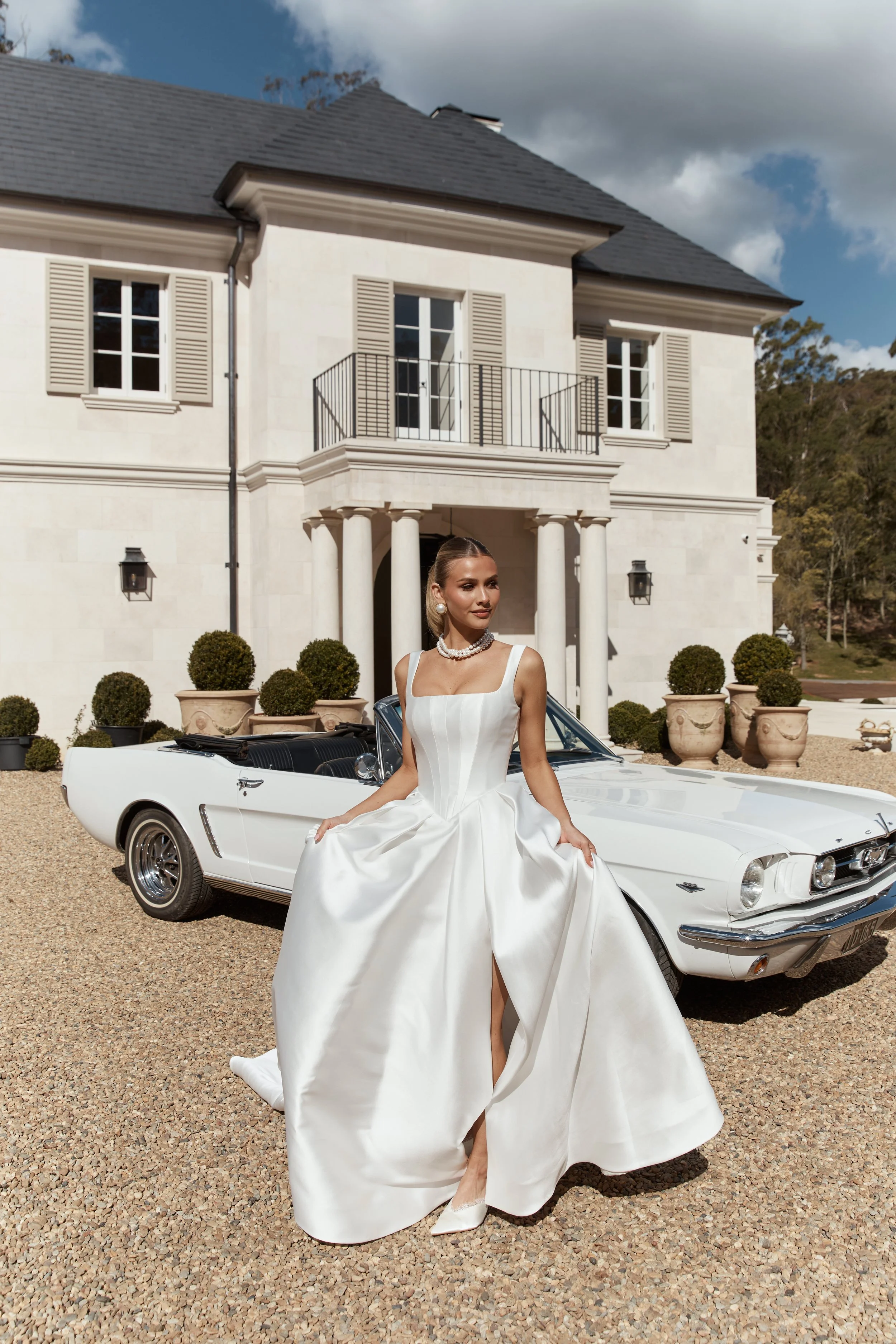 A modern classic, Navy blends structured elegance with contemporary edge. The clean square neckline and wide straps frame the décolletage beautifully, while the sculpted basque waist creates a flattering, lengthened silhouette. Crafted in our signature luxe fabrication, the full skirt flows effortlessly with a thigh-high split for added impact.