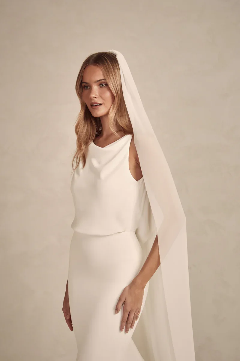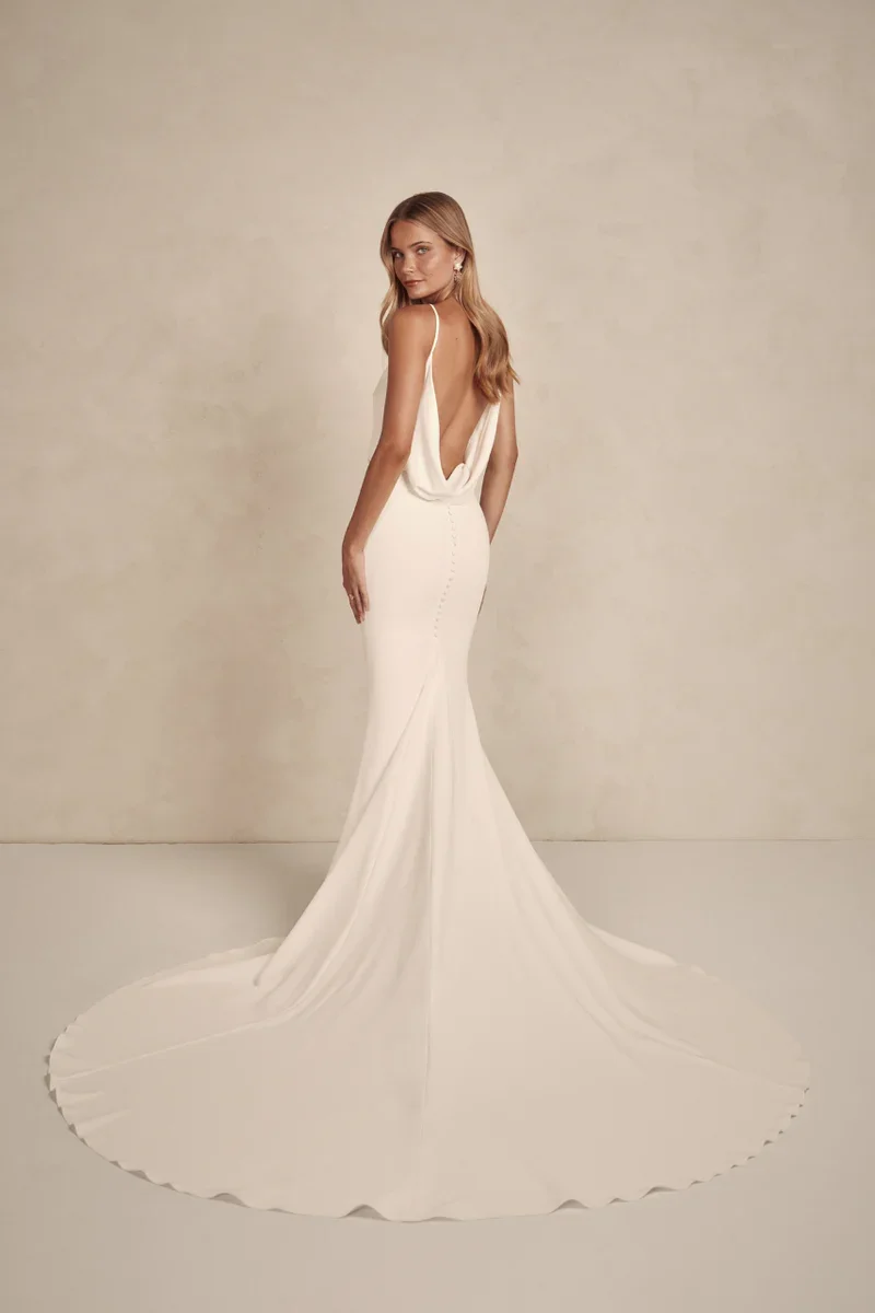 MWL is known for our iconic cowls and Alfie's perfected pattern does not disappoint. Putting a new intricate twist on one of their iconic design elements, Alfie's double, crossed-cowl back is sure to draw the eye. Her flattering boat neck and delicate bodice draping contrasts perfectly with her renowned MWL fitted French crepe skirt, with a godet to hug your curves in all the right places.