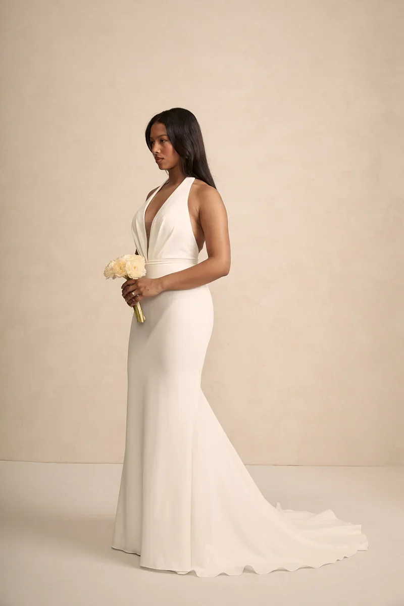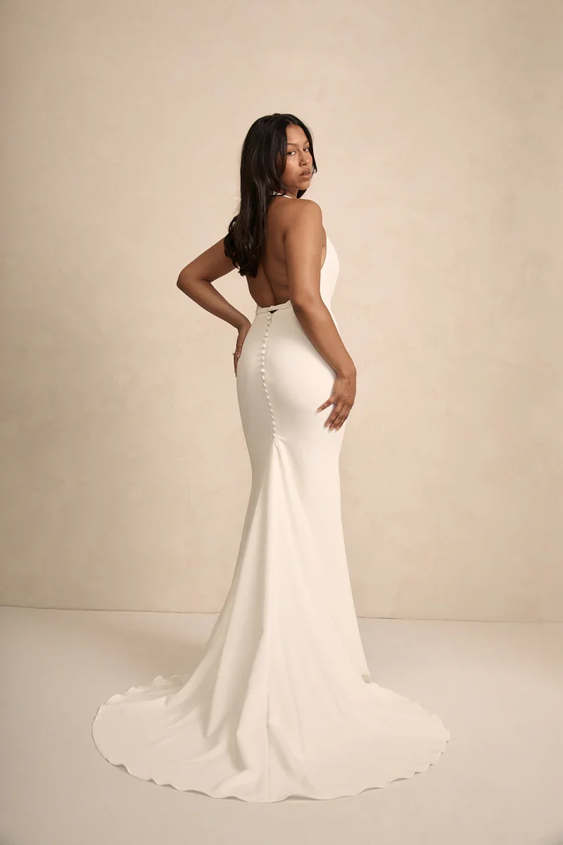 Audrey is for the daring bride who's not afraid to make a statement on her big day; combining a completely backless aesthetic with MWL's iconic plunging neckline to the waist. Audrey also features a signature MWL removable crepe belt that creates a gorgeous subtle cut-out effect due to her low back. Made of our supportive signature French Crepe, Audrey not only hugs all of your curves perfectly, but is comfortable enough to wear down the aisle and later on the dancefloor. Audrey's beauty is truly understated, yet she is sure to turn heads in the best possible way and her timeless beauty leaves space for personalisation with accessories. Pair Audrey with MWL’s new Crepe Ties for a halter-like modern spin on this otherwise classic bridal look.