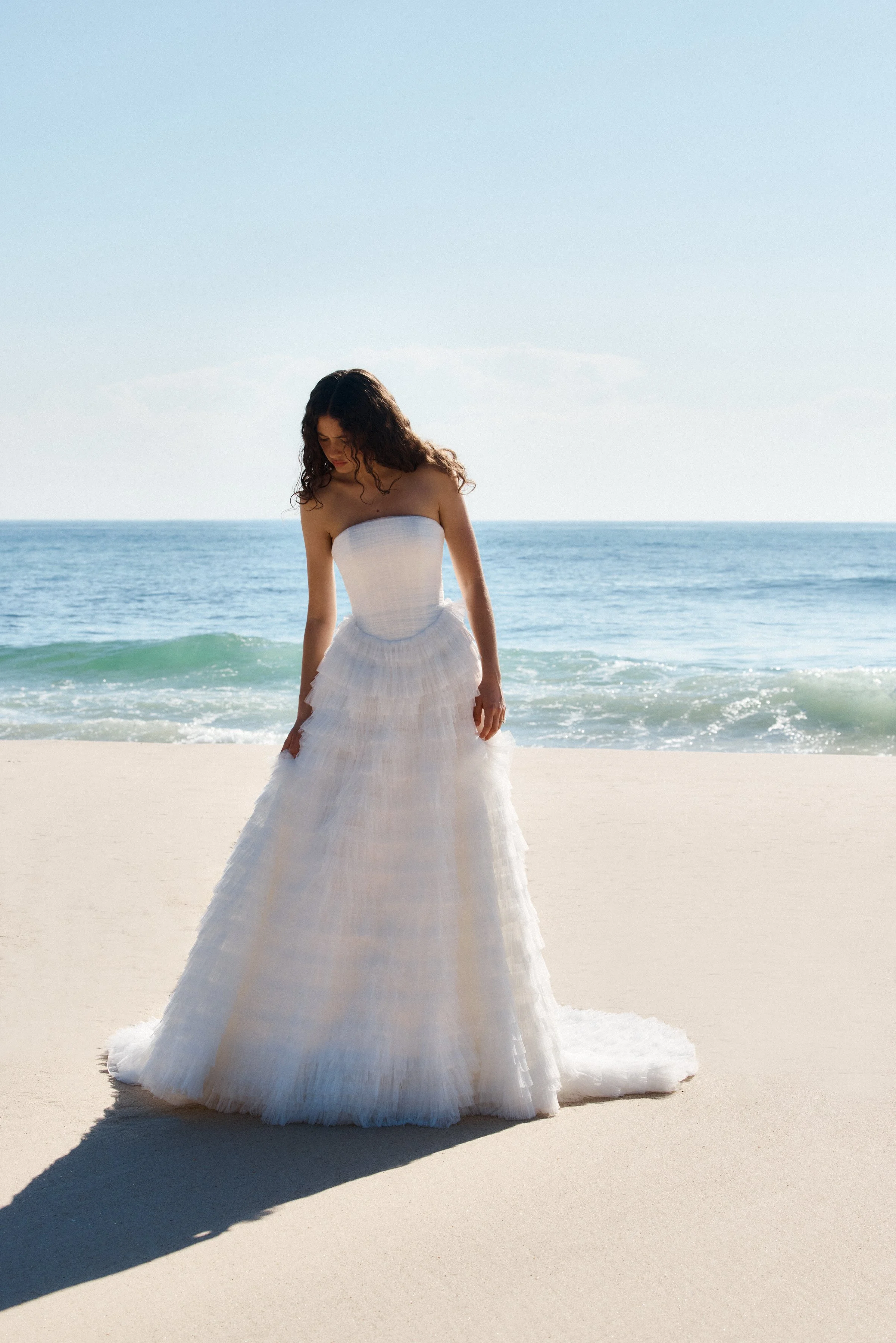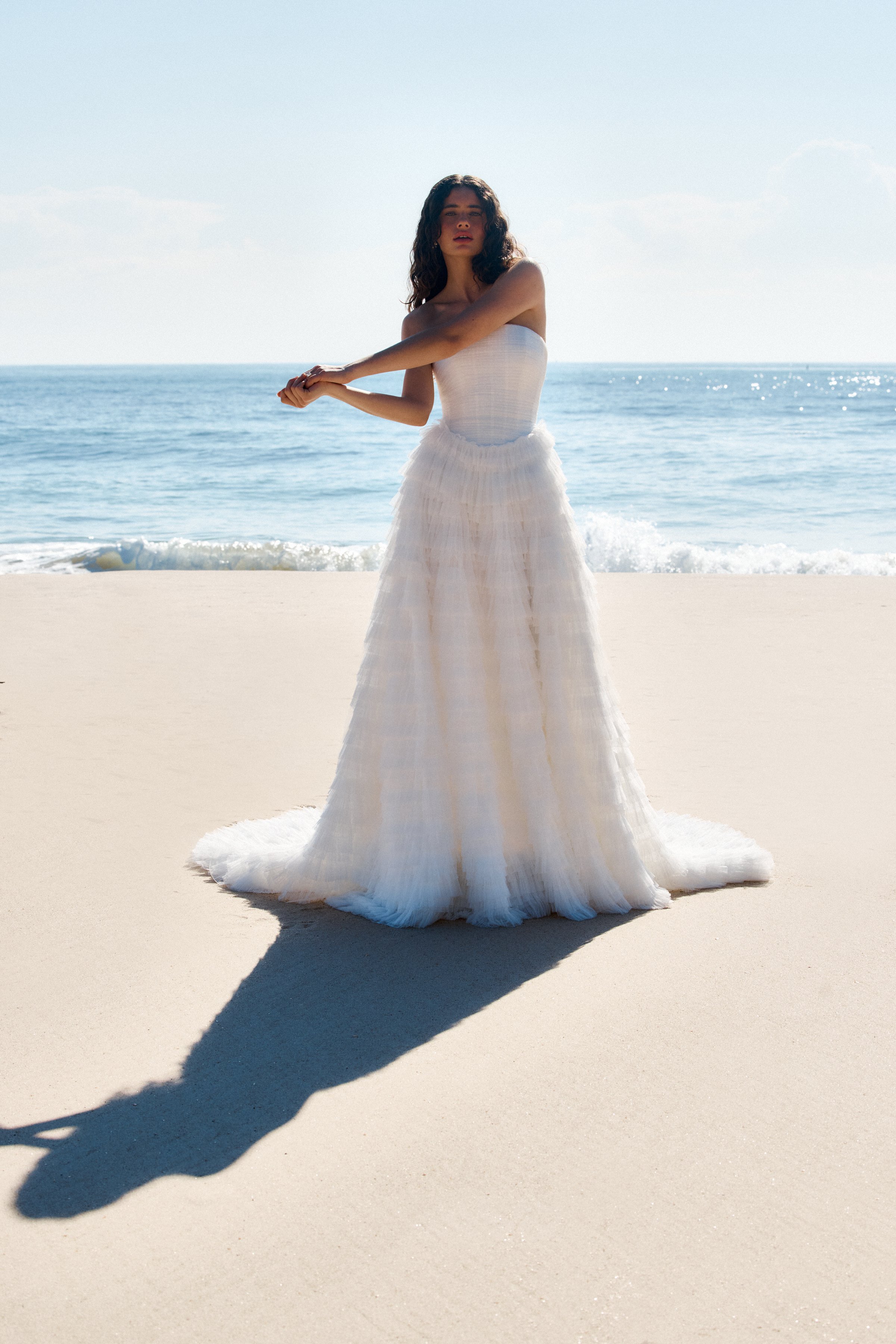 Banks is a poetic evolution of the adored Jean, reimagined with entirely new bodice and skirt patterns, yet echoing the same soft, layered romance that made her unforgettable. Crafted in signature Jean fabric, Banks is adorned with delicate pleated tulle, creating a gown full of dreamy texture and graceful dimension.