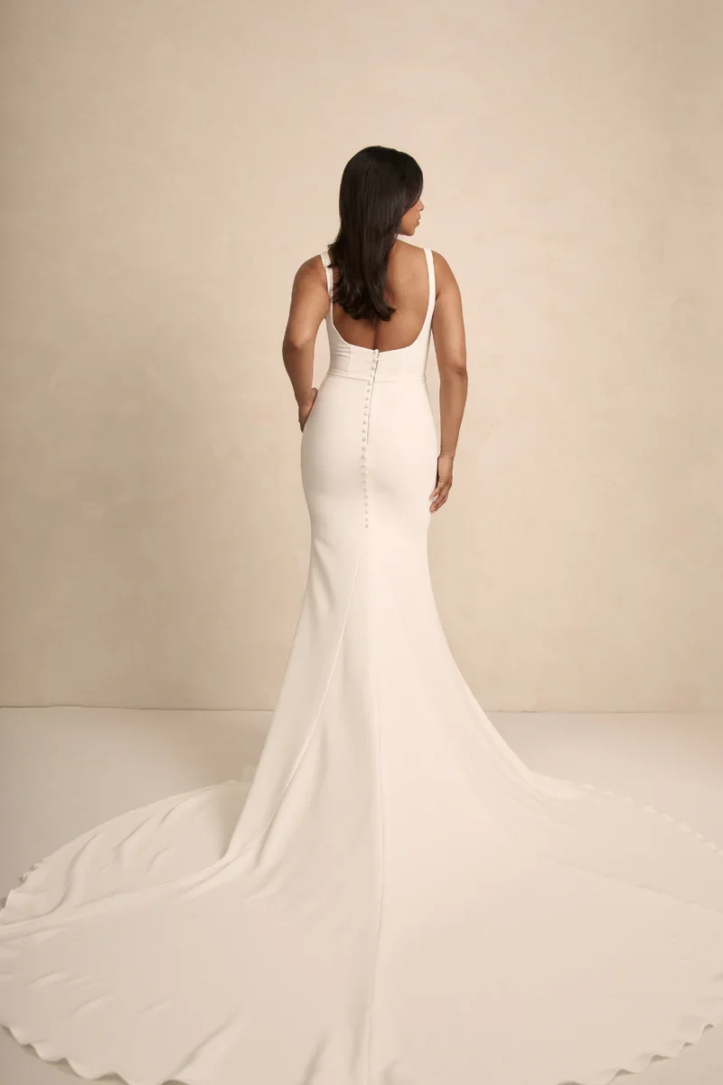 Hunter's gorgeous crepe and timeless silhouette pairs perfectly with any MWL veil or accessories, making her the ideal dress for any bridal aesthetic.