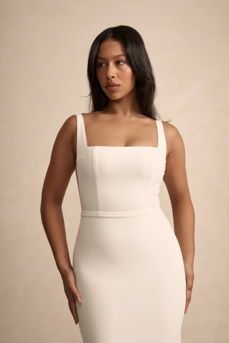 Hunter was designed with the MWL Girls' ultimate dream dress in mind. She combines a forever-highly-requested square neckline, illusion tulle cut-outs, higher square back, complimented perfectly by her figure-framing buttons and crafted with MWL’s iconic, supportive French crepe.
