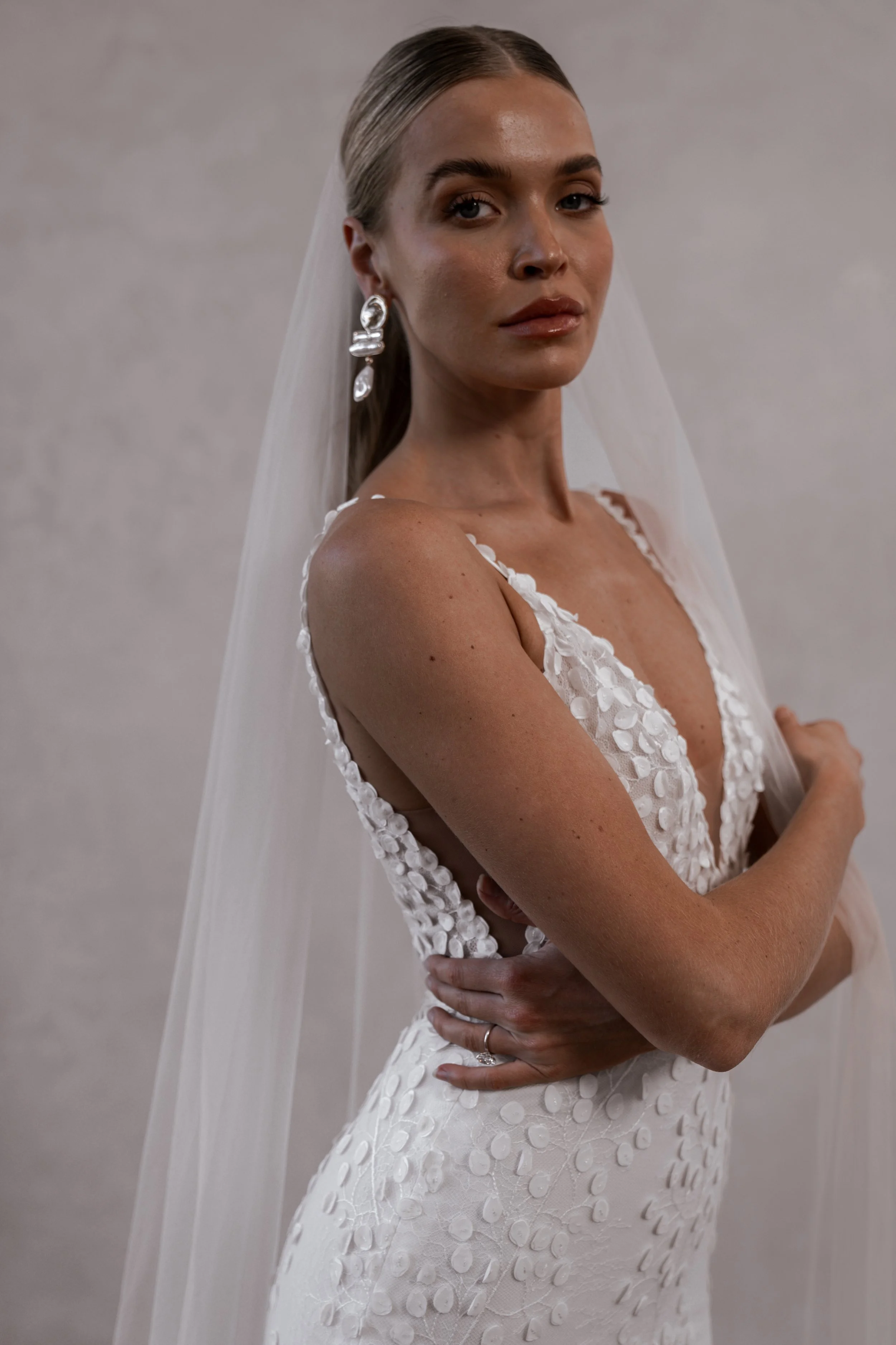 Combining a dreamy deep V neckline and statement low back, Louie V2’s delicate, soft, 3D petal lace is the answer to all of our dreams!