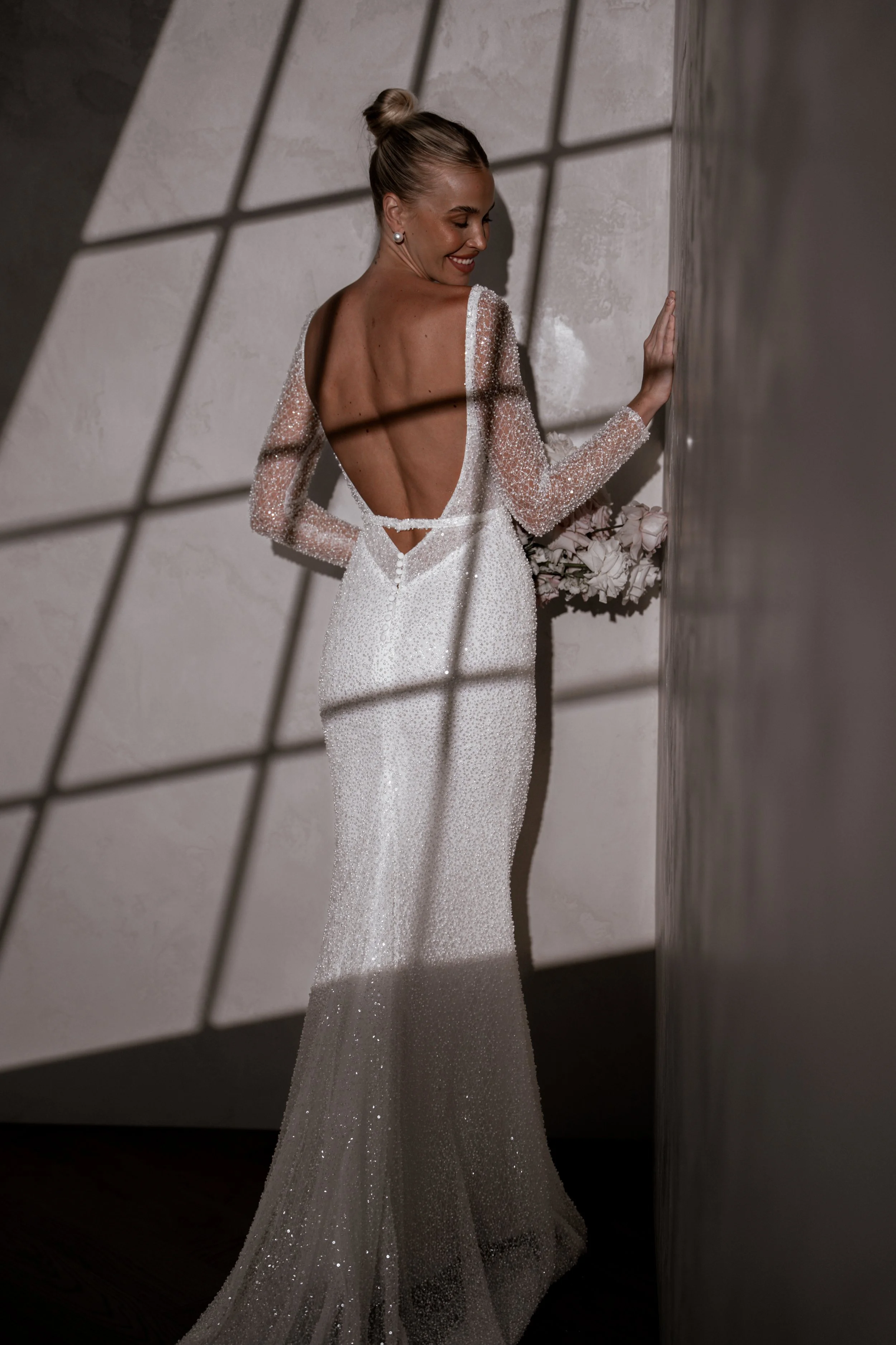 Margot is an icon, radiating pure luxury with her pearlescent beading, long sheer sleeves and perfectly draped detachable cowl. She also features a stunning detachable belt that further elevates the modernity of her design, creating the perfect cut out illusion when paired with her contoured low back. Margot is the embodiment of elegance, class and opulence.