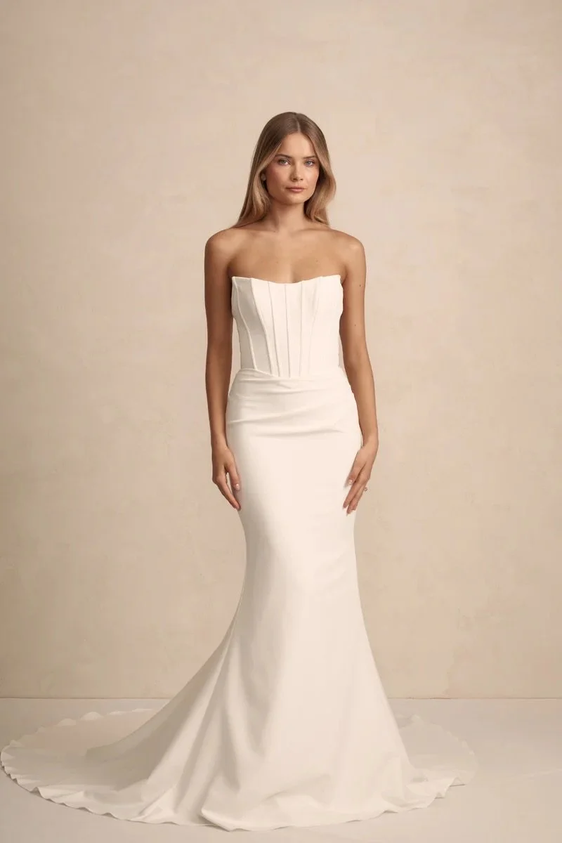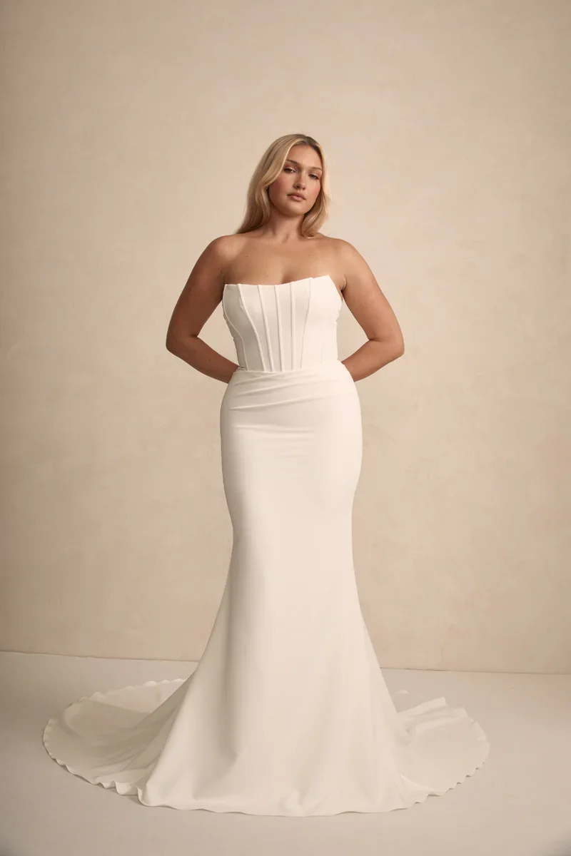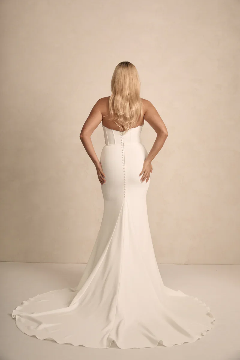 Rhode is breathtaking strapless crepe wedding dress that effortlessly combines modern elegance with timeless romance. The striking bodice features a peaked design at the bust with statement exposed boning, sculpting your silhouette with an alluring yet refined edge. Soft French crepe draping cascades gracefully from the waist to the hips, creating a flattering silhouette that moves beautifully with every step keeping you comfortable and confident.