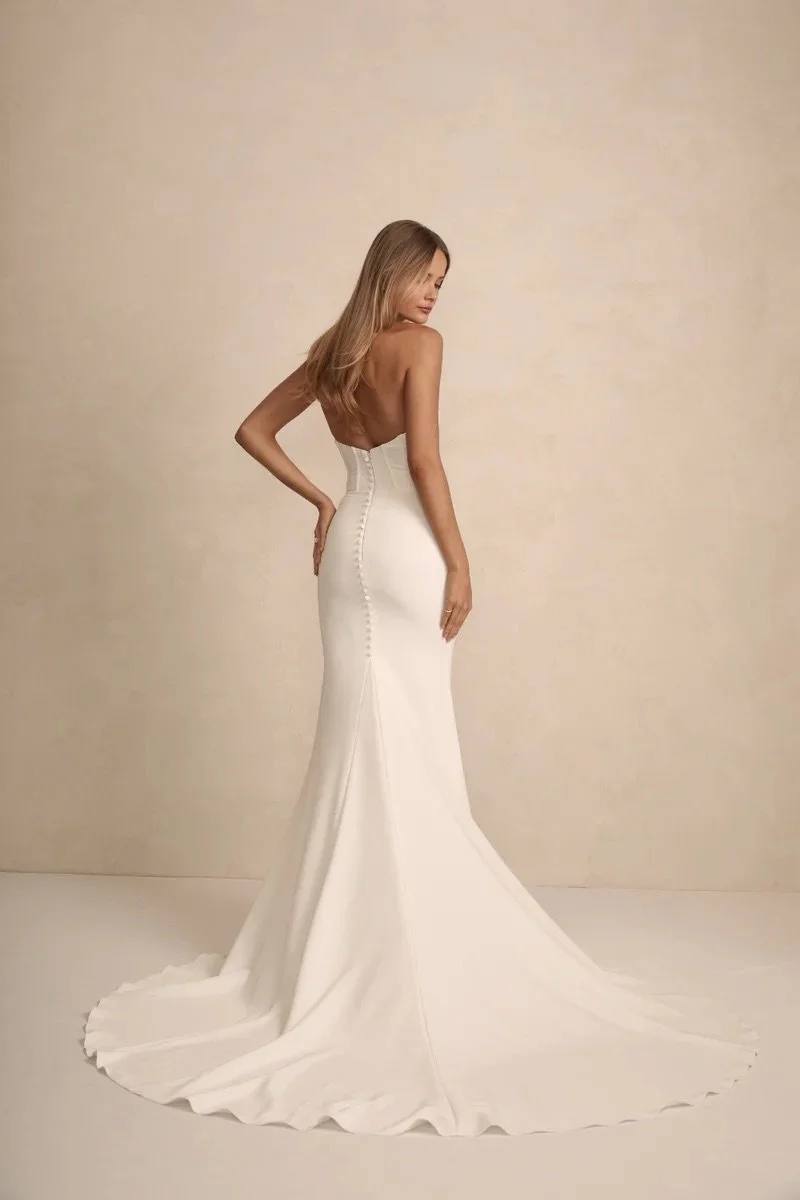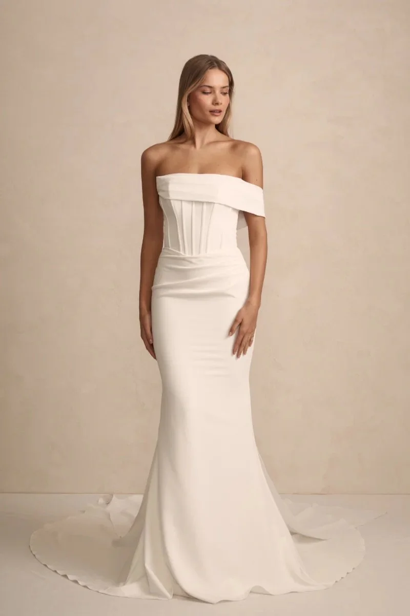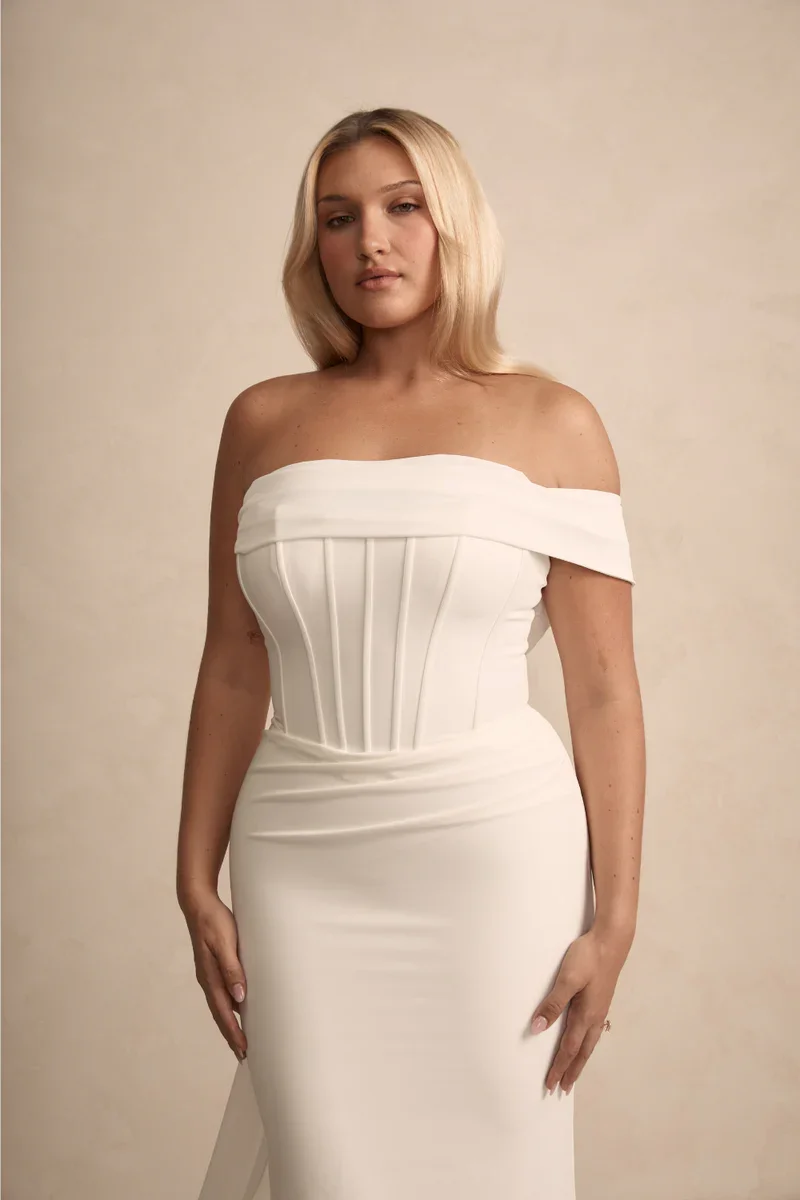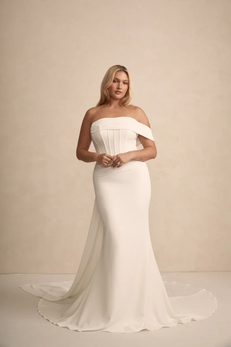 Rhode is breathtaking strapless crepe wedding dress that effortlessly combines modern elegance with timeless romance. The striking bodice features a peaked design at the bust with statement exposed boning, sculpting your silhouette with an alluring yet refined edge. Soft French crepe draping cascades gracefully from the waist to the hips, creating a flattering silhouette that moves beautifully with every step keeping you comfortable and confident.