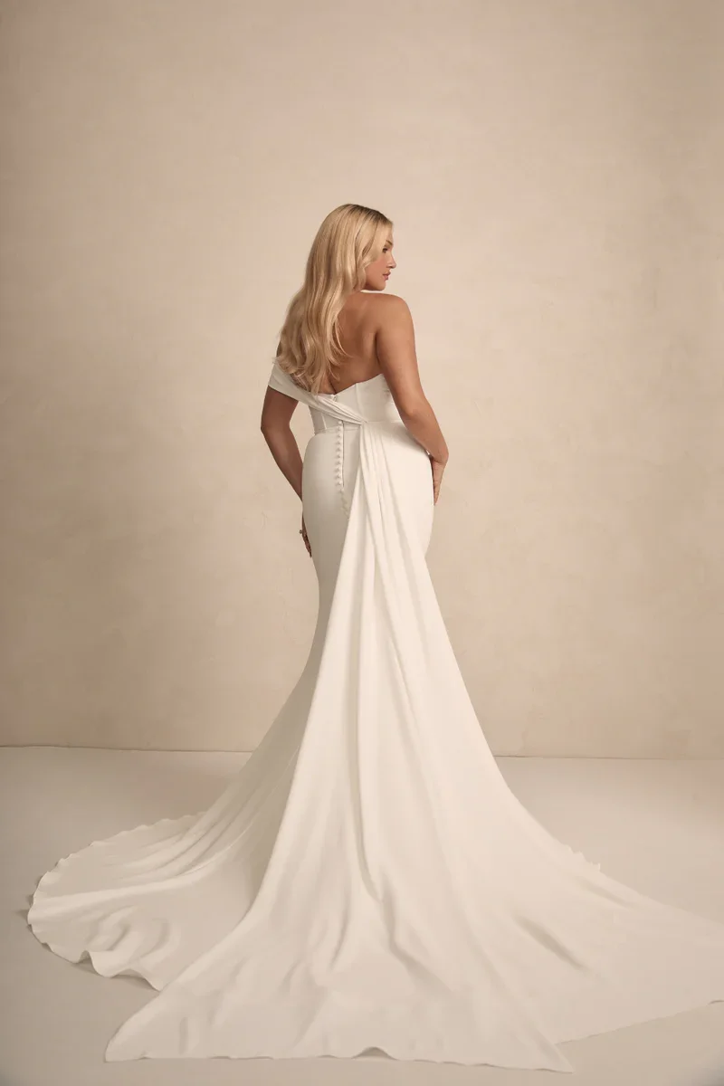 For added drama, this gown comes with a detachable train, allowing for a stunning entrance and an easy transition to celebrations later in the evening. The optional, detachable asymmetrical off-the-shoulder feature adds a touch of whimsy, beautifully framing the neckline and enhancing your bridal look. Designed for the contemporary bride, this dress is perfect for making a statement while offering versatility throughout your special day.