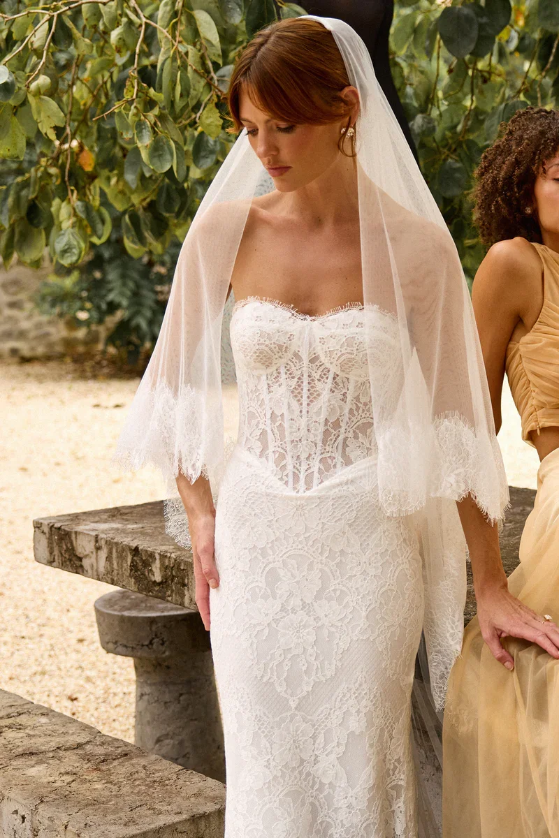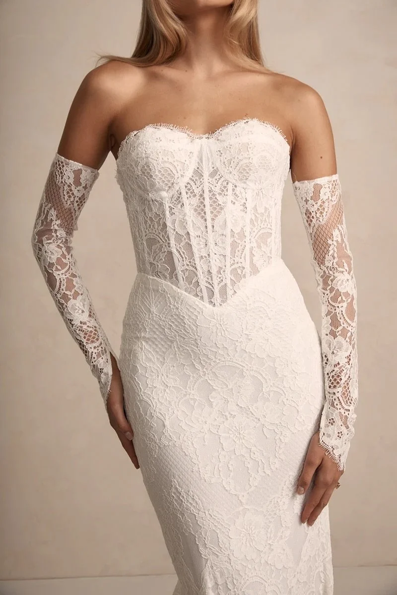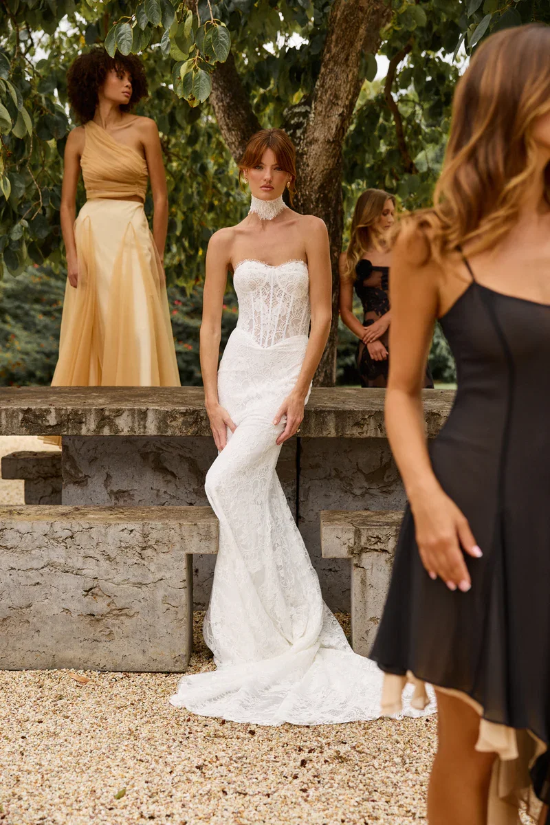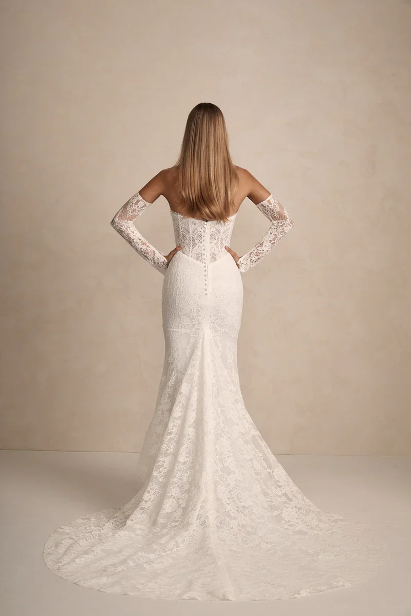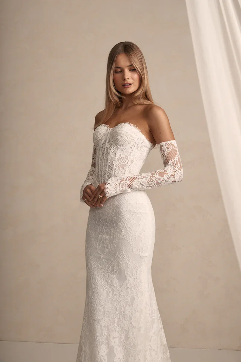 Winnie basque’s intricately beautiful Chantilly lace with stunning eyelash edges truly shines in both our classic ivory or modern sand colour-ways. Paired with her sheer removable sleeves and contouring bodice boning, she is a beauty that is sure to endure the test of time, giving a nod to tradition, yet fiercely embraces modern trends.